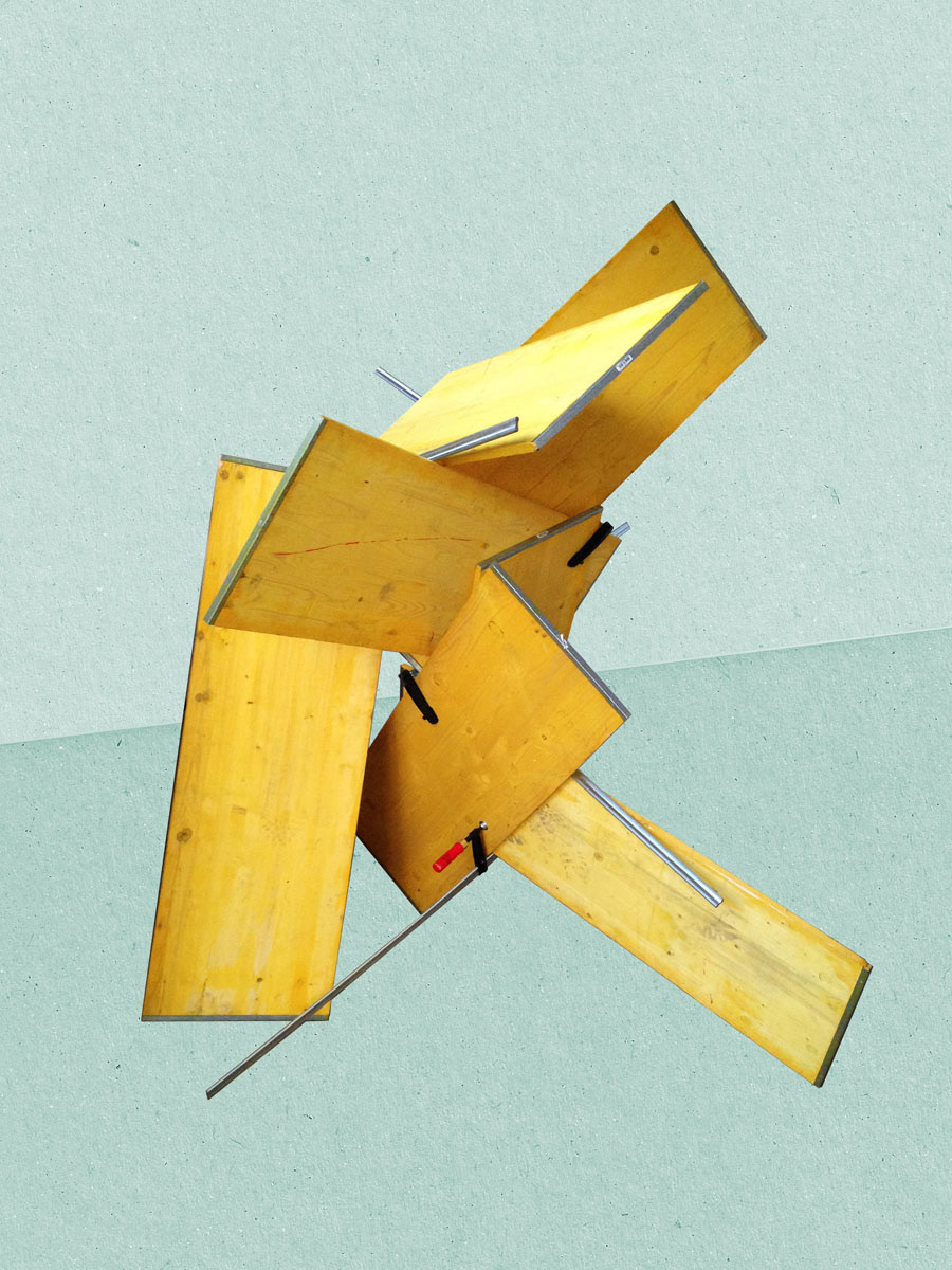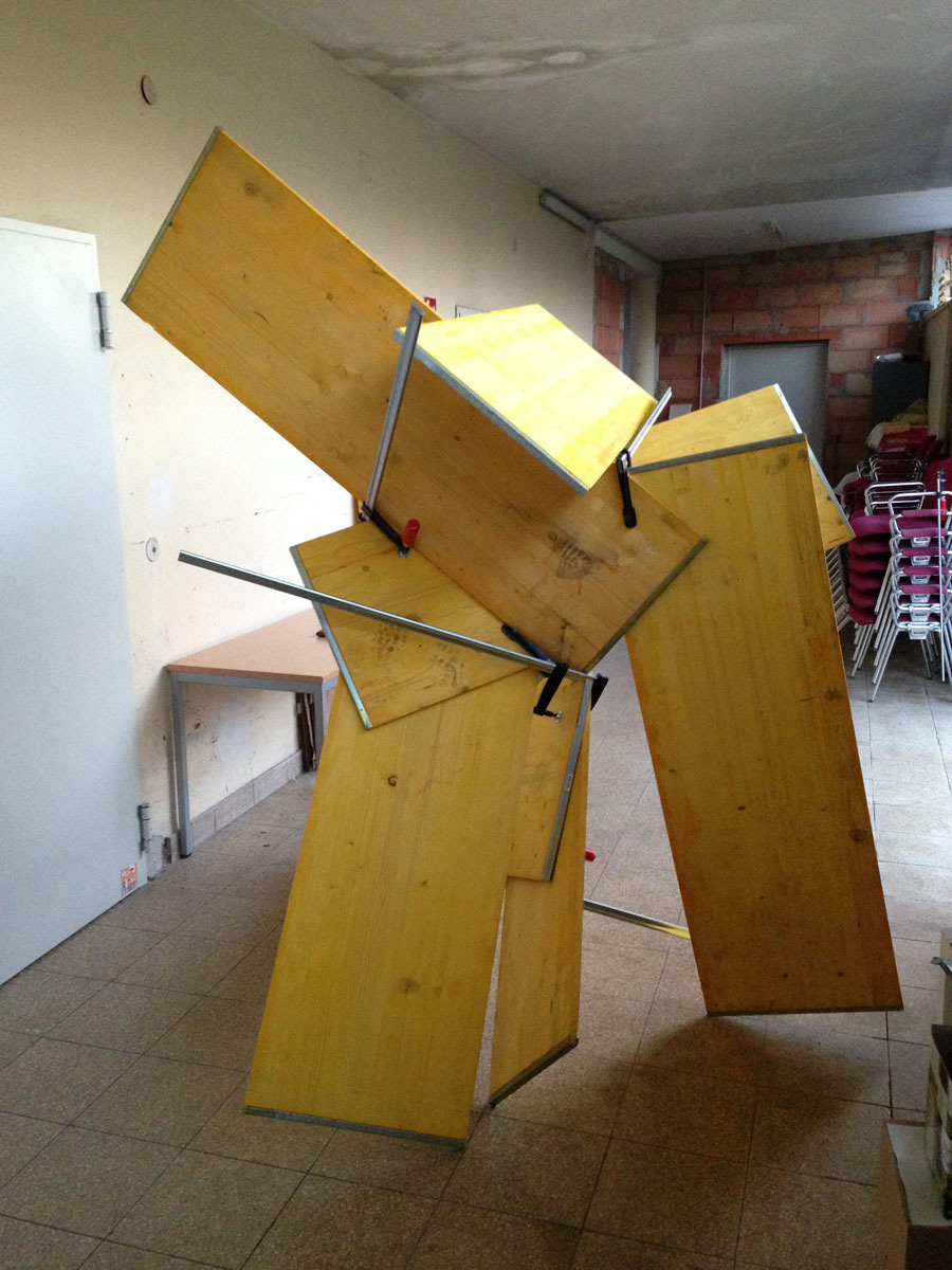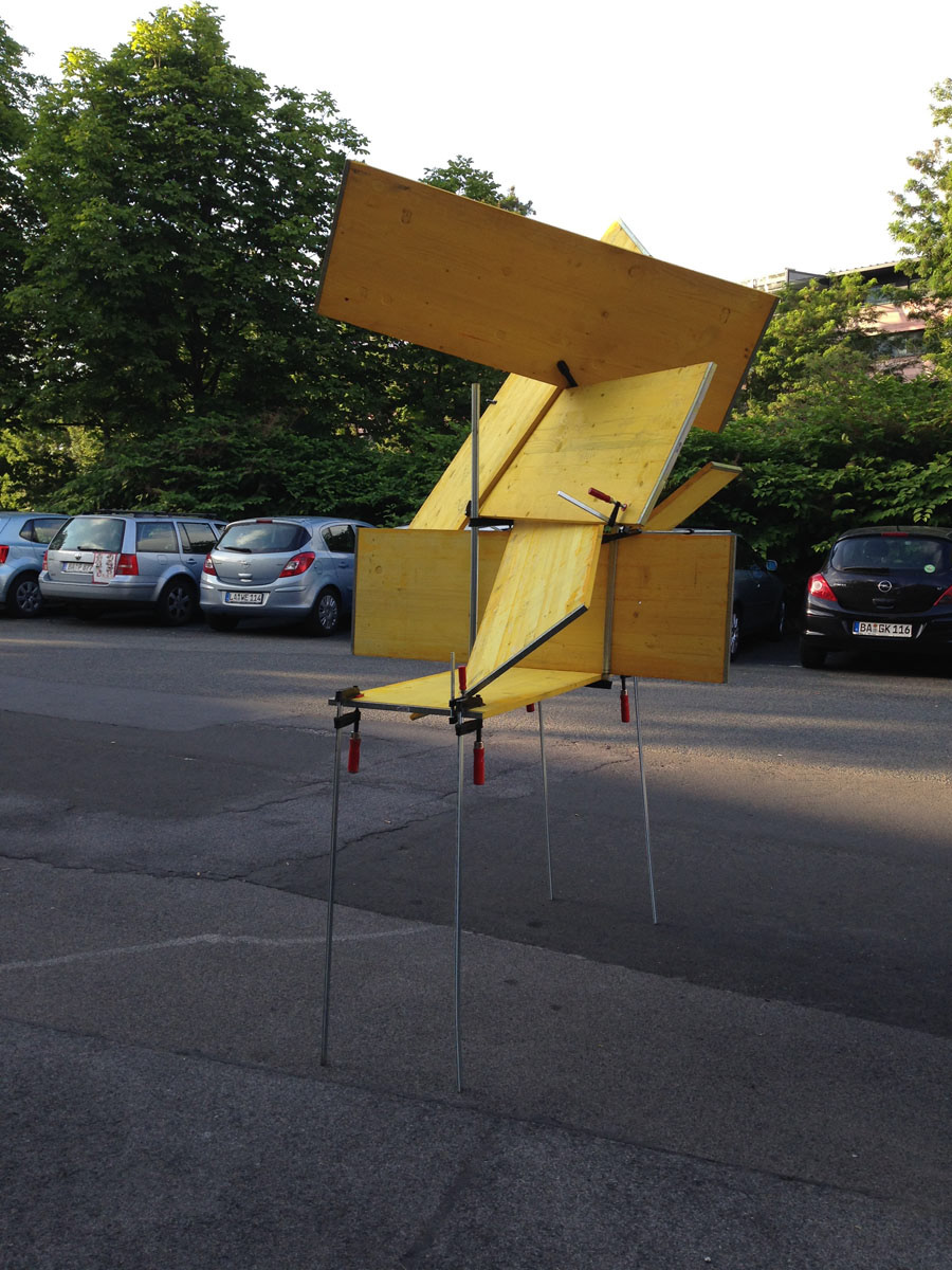 Temporäre Konstruktionen aus Schaltafeln und Schraubzwingen, beim Festival für Sound-Musik-Kunst FK:K im Kunstraum Kesselhaus, Bamberg